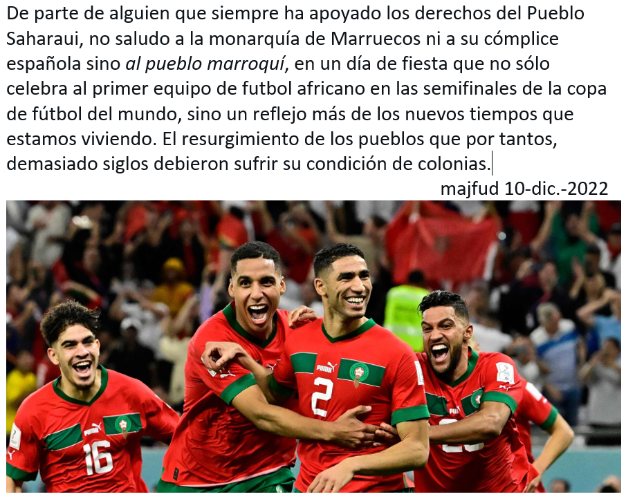 De parte de alguien que siempre ha apoyado los derechos del Pueblo Saharaui, no saludo a la monarquía de Marruecos ni a su cómplice española sino al pueblo marroquí, en un día de fiesta que no sólo celebra al primer equipo de futbol africano en las semifinales de la copa de fútbol del mundo, sino un reflejo más de los nuevos tiempos que estamos viviendo. El resurgimiento de los pueblos que por tantos, demasiado siglos debieron sufrir su condición de colonias.