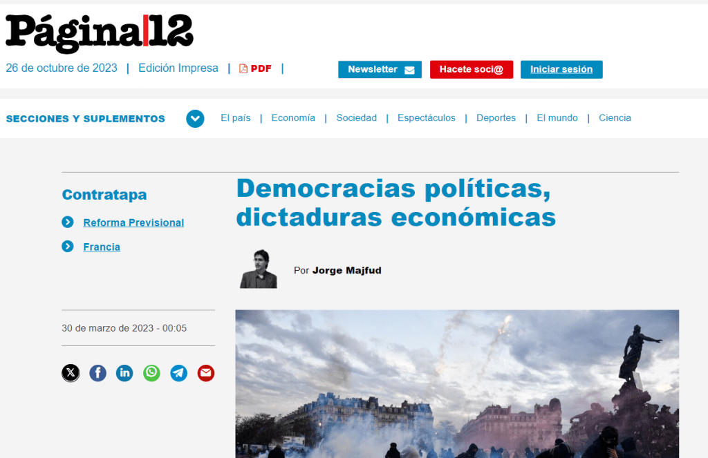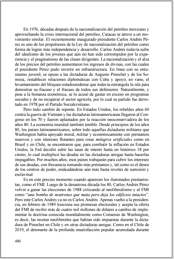 En esta recta final de las elecciones en Argetnina, sugiero no olvidar en cualqueir debate que la «hiperinflación de R. Alfonsín» (única razón por la que Milei dice que fue el peor presidente de la historia argentina) a fines de los 80s siguió a una deuda externa descontrolada de la dictadura militar y ultraliberal («libertaria»). Una historia similar de la actual inflación de A. Fernández, luego de la vuelta al hiperendeudamiento de Macri con el FMI. No es casualidad que el Mesías de Milei explica todo citando a F. Hayek, quien visitó a Pinochet y a su regreso dijo que prefería una dictadura que respetase el liberalismo y no una democracia que no lo respetara. Al menos hay que reconocerle cierta honestidad. (las páginas son de La frontera salvaje. 200 años de…)