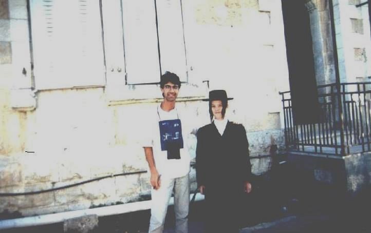 Por venir de Uruguay, un país que no entiende esas cosas, intenté no darle importancia y le pedí a un transeúnte que nos sacara una foto con mi Zenit que cada vez que hacía sui trabajo parecía que se partía. Murió en Mozambique dos años después, debido a que me caí en las aguas de océano Indico en el barco que nos llevaba a Joseph Hanlon, a su esposa Threse y a mí a una isla del norte. La Zenit murió salinizada entonces, en 1997, pero logaré rescatar el último rollo. Esta es la foto, do años antes, en Jerusalén, con ese muchacho tan simpático. Quién sabe qué será de él hoy…. En un restaurante árabe de la Cudad Vieja de Jerusalén escribí https://majfud.org/2011/01/30/apocrifo-romano/