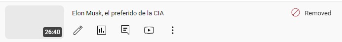 Hace unas semanas tuve una conversación de media hora con RTv (como suelo tener con cualqueir otro canal del mundo y como vengo haciéndolo con RT desde 2010) sobre los negocios de Elon Musk con la CIA. Lo subieron a un canal de YouTube y Youtube (Google) lo removió «por contenido inapropiado». Sospecho que debo aceptar más invitaciones de RT.