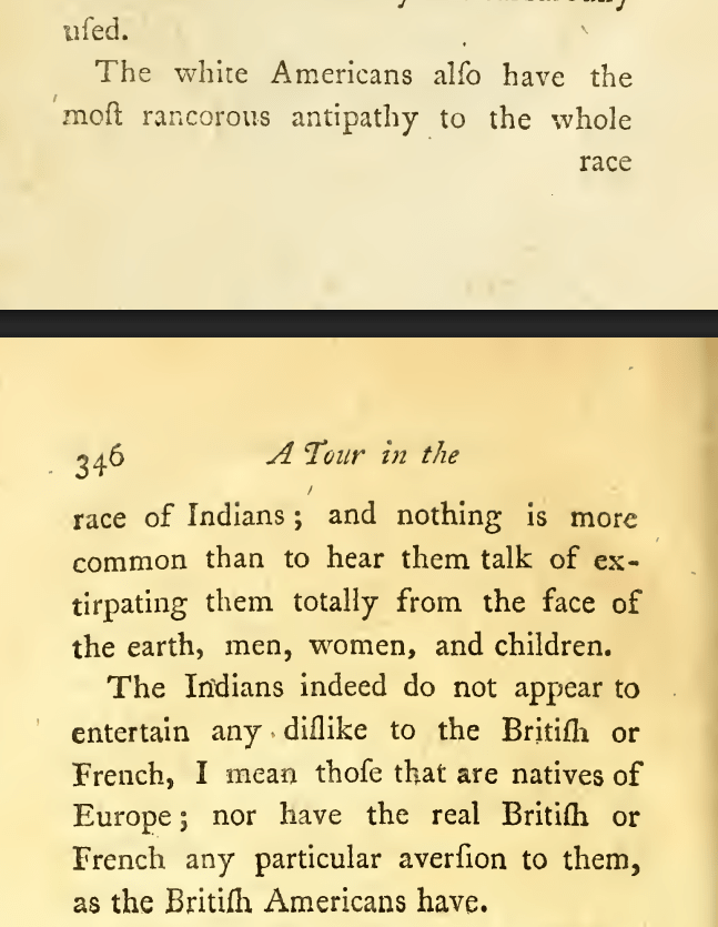 Una mínima perla de mi actual investigación (sin pulir aún): «En 1784, el británico John Ferdinand Smyth, anotó en su libro A Tour in the United States of America: Containing an Account of the Present Situation of That Country que “los americanos blancos sienten una profunda antipatía por toda la raza indígena; y no hay nada más común que oírlos hablar de extirparlos totalmente de la faz de la tierra: hombres, mujeres y niños. Por el contrario, los indios no parecen sentir ningún desprecio por los europeos”.