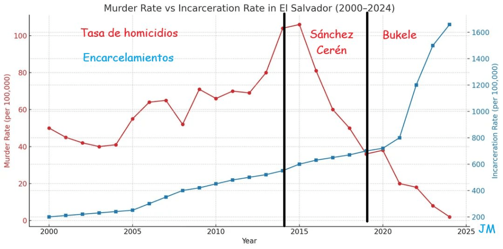 La primera expresión no tiene nada de ambigua. Bukele y El Salvador son “el ejemplo” para discutir la seguridad. ¿Necesitamos un teólogo para interpretar esto? Si hubiese dicho “en materia de seguridad, Cuba es el ejemplo” no habría quedado duda. ¿Por qué no decirlo? Cuba ha tenido una tasa de criminalidad históricamente muy baja. O Chile, cuya tasa de homicidios es la mitad de la de Uruguay. ¿Por qué El Salvador? Más que El Salvador, ¿por qué “el ejemplo es Bukele”, a pesar de que la dramática reducción de los homicidios se produjo en el gobierno de Sánchez Cerén y sin recurrir a los campos de concentración ―su pecado fue desafiar a las corporaciones. Pero, no sin ironía, Bukele ofrece otro ejemplo de la palestinización del mundo que estamos viendo, incluso en Estados Unidos: brutalidad sin ley, cárceles coloniales y datos a la medida del consumidor, como reportar asesinatos como suicidios o accidentes.